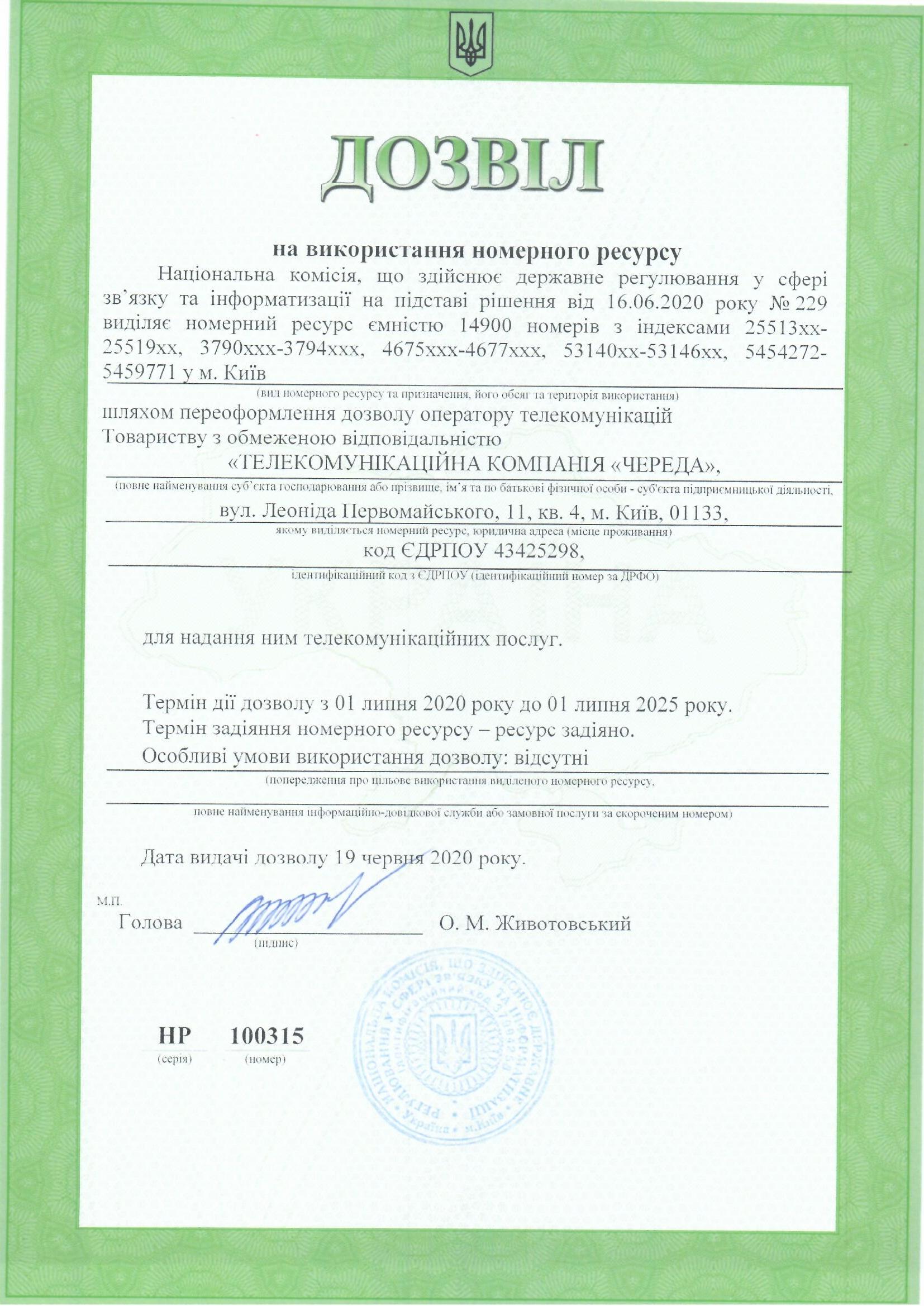 Документи Оператора зв`язку ТОВ "ТЕЛЕКОМУНІКАЦІЙНА КОМПАНІЯ ЧЕРЕДА"